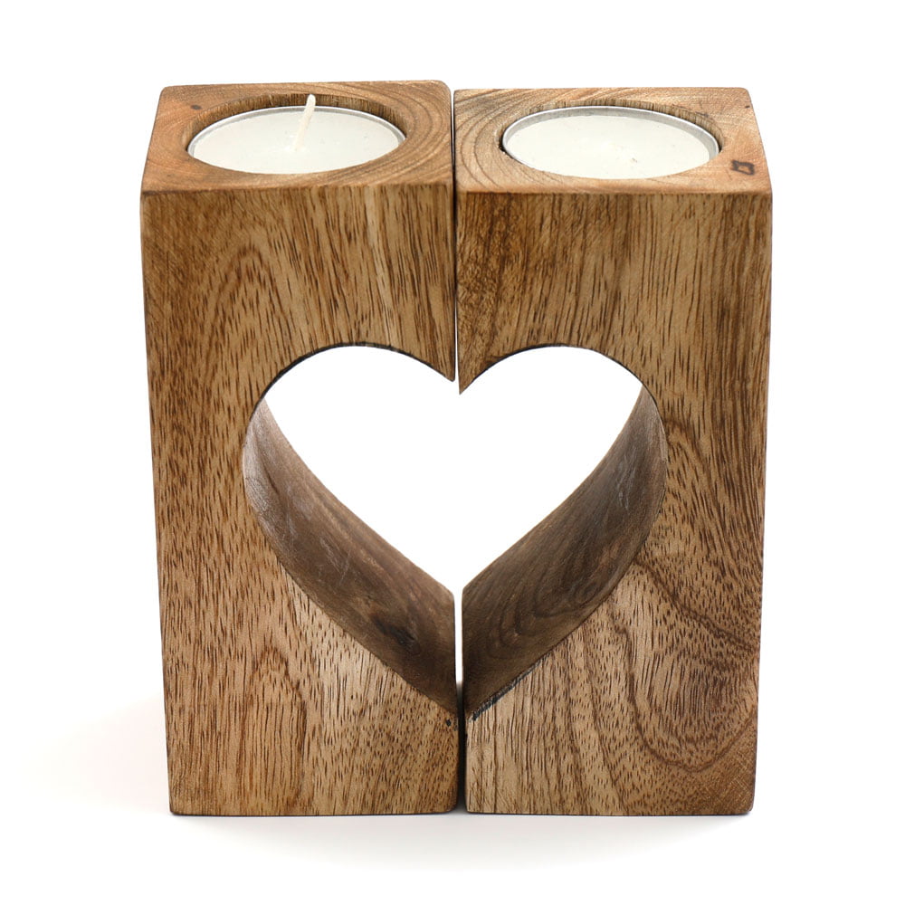 This unique tealight holder is made out of mango wood and fits together to make a classic love heart shape. Unscented tealights included.